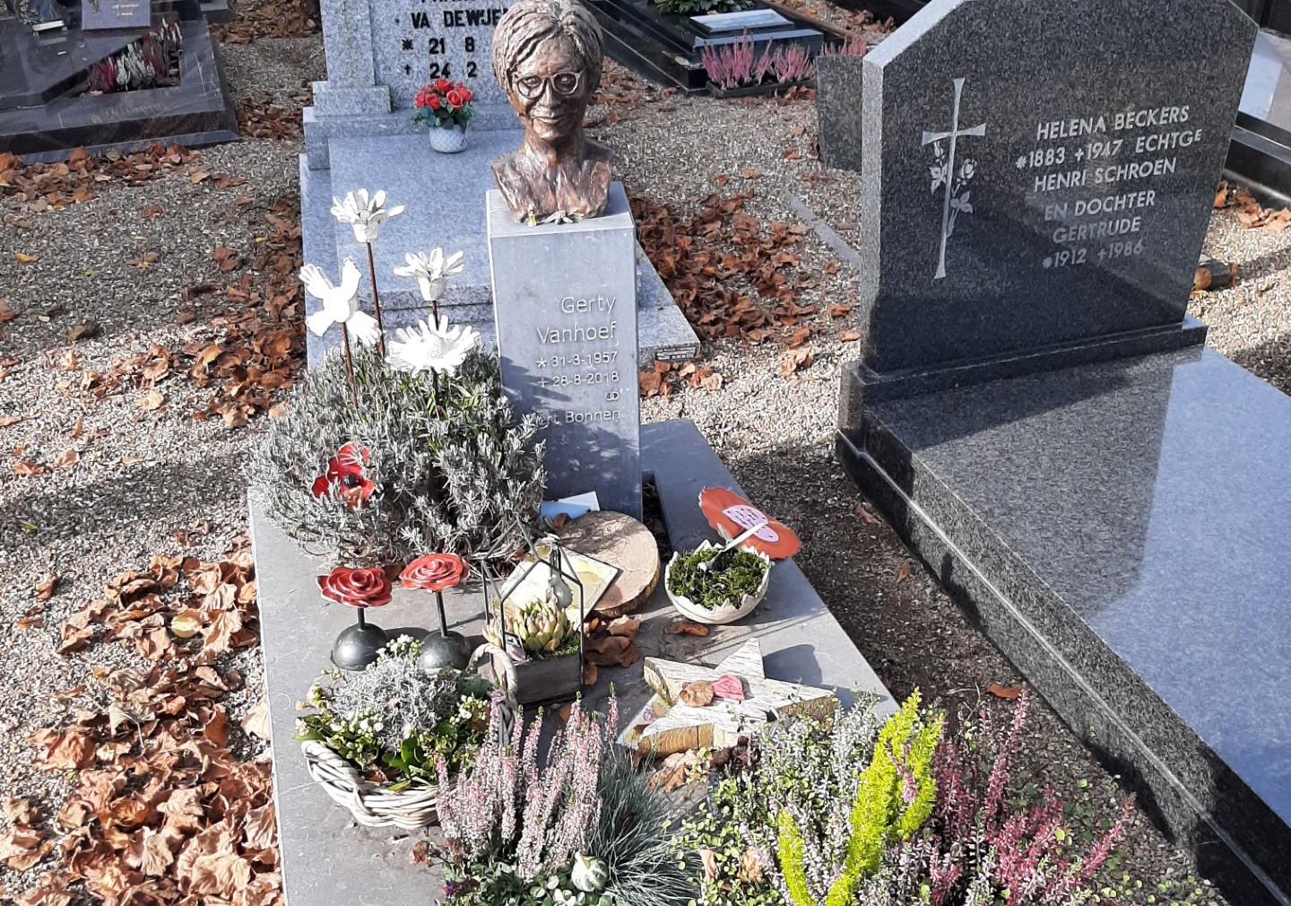 ‘De Damiaanhoeve speelt zich af in de uiterwaarden van de Maas, waar hoofdpersoon Bert met geen honderd boerenpaarden valt weg te slepen van zijn erf. Ondanks overstromingen en het verlies van grond door ontgrinding. Het is slechts een voorproefje van het drama dat zich vervolgens op de hoeve voordoet: zijn vrouw Gerty wordt vermoord, het huis wordt in brand gestoken en hijzelf is volgens het parket “juridisch gezien verdachte”.’ (Foto: Gerty’s graf)